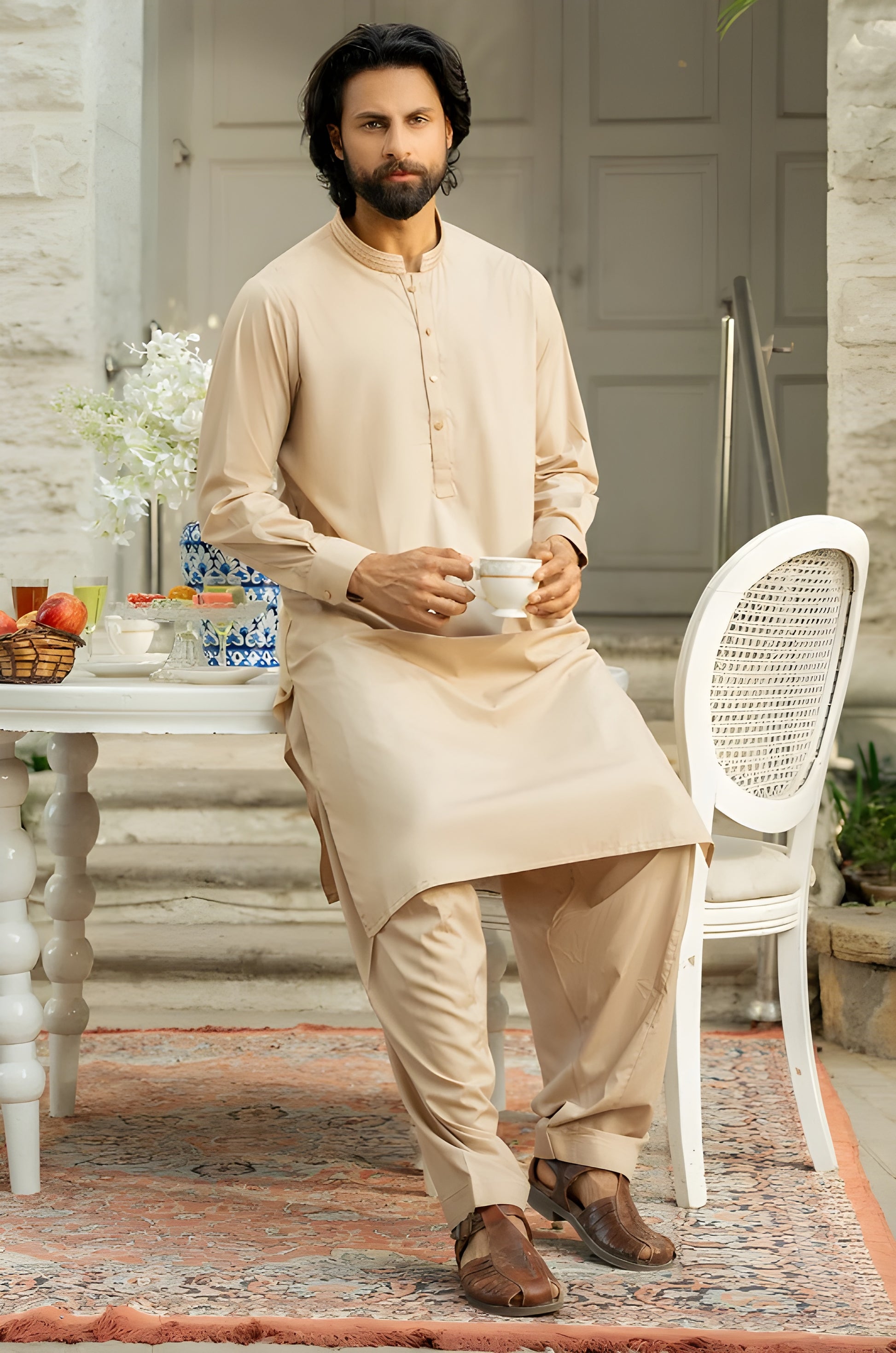 Stay stylish in simplicity with the Beige Wash & Wear Unstitched Suit by The AK Collection.