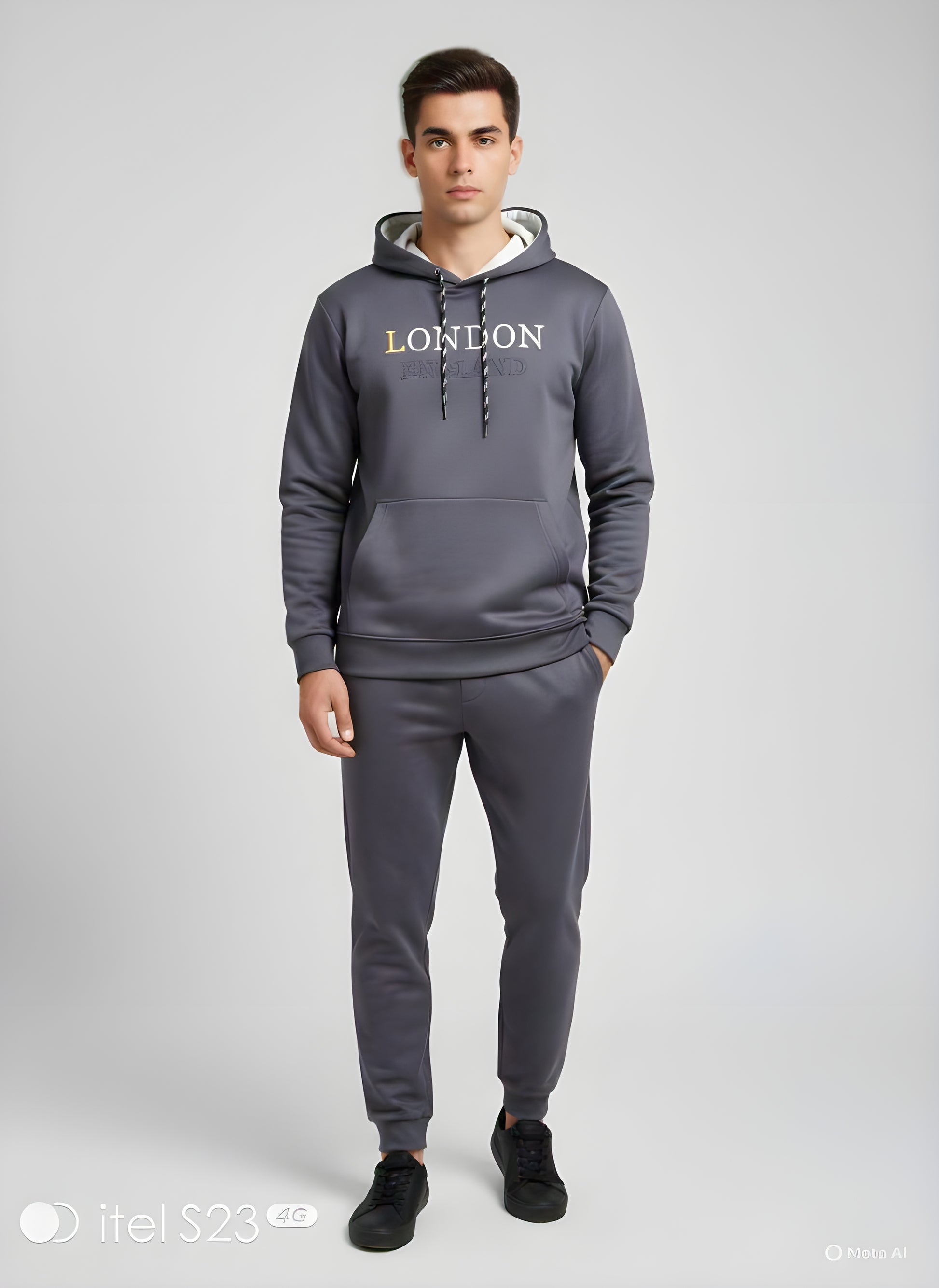 This charcoal grey hoodie and jogger set gives a sleek and athletic look, perfect for everyday wear, workouts, or travel. The hoodie features a stylish LONDON ENGLAND print with adjustable drawstrings and a front pocket for a functional touch.