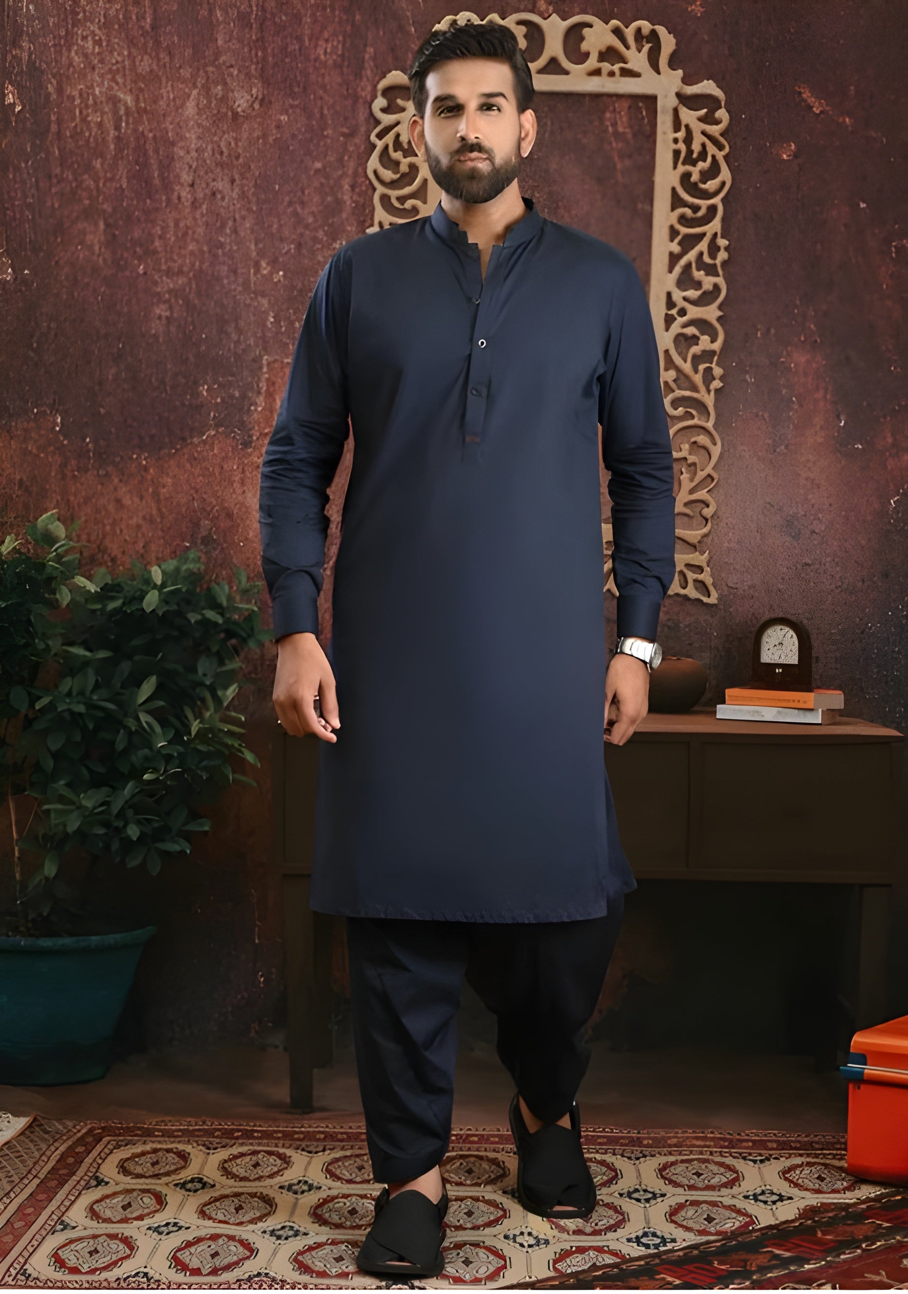 Add timeless elegance to your wardrobe with the Navy Blue Wash & Wear Unstitched Suit from The AK Collection.